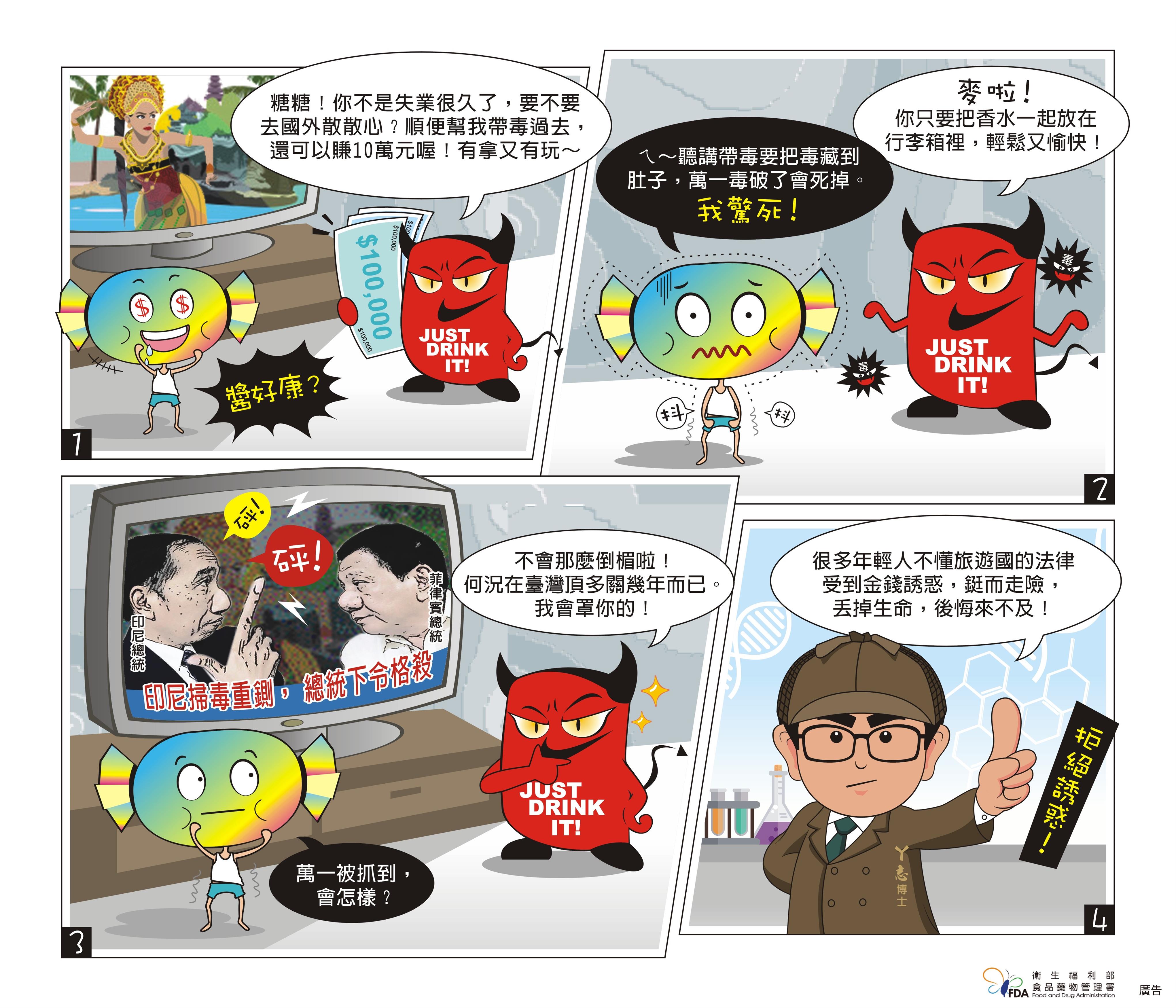反毒四格漫畫_拒當運毒手(出處衛福部食藥署)