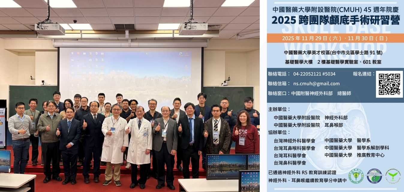 The Multidisciplinary Skull Base Surgery Workshop, co-organized by the Departments of Neurosurgery and Otolaryngology of China Medical University, with the participation of invited experts from across Taiwan