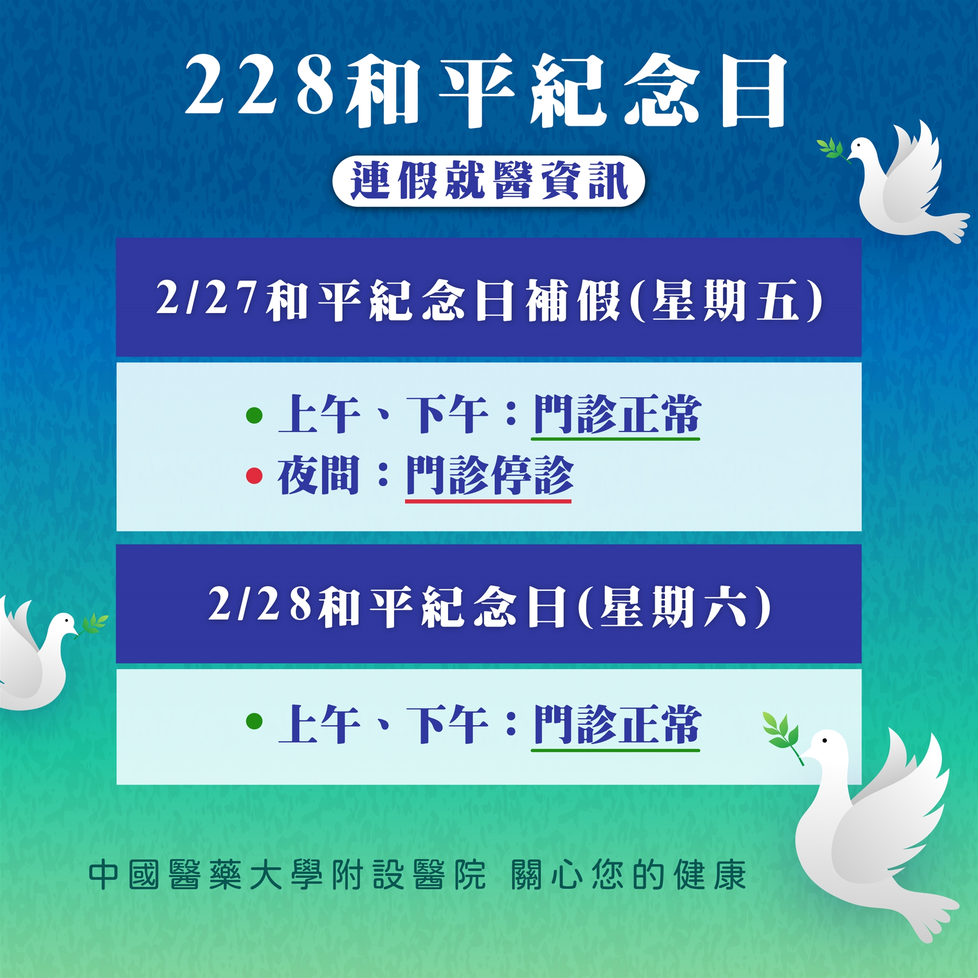 適逢 228 和平紀念日連續假期,為保障您的就醫權益,中國醫藥大學附設醫院於連假期間(2/27 - 2/28)之門診服務時間將進行部分調整。敬請有就醫需求的民眾多加留意,避免向隅。