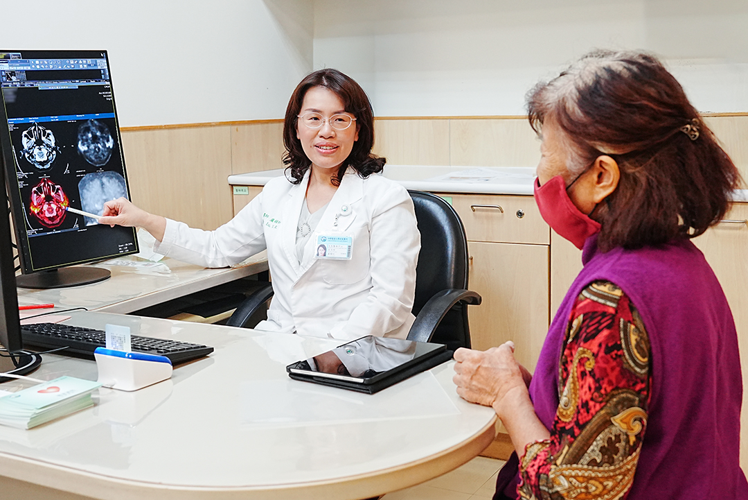 中醫大附醫失智醫療中心副主任盧韻如醫師(左)於診間為陳女士(右)進行病情評估,協助病人找到最適合的治療方案。(發亮處即為澱粉蛋白沉積)