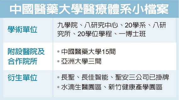 答:我們的發展有一定的計畫,第一步先從中國醫藥大學及亞洲大學兩個教育單位開始做起。中國醫藥大學附設的醫療院所及合作院所已有15家、亞洲大學附設醫療院所也有三家。我們鼓勵教授及醫師投入研發,拿專利,取得專利後再進行技轉,技轉金回饋學校,學校再用回饋金繼續支持研究,目前中國醫藥大學的衍生企業已有20家,其中有八家是由我催生成立的,目前有長聖、長佳智能及聖安三家公司已經進入資本市場,明年第四家、長聯科技也將進入資本市場。中國醫藥大學來自衍生企業的回饋金已達15億元以上。