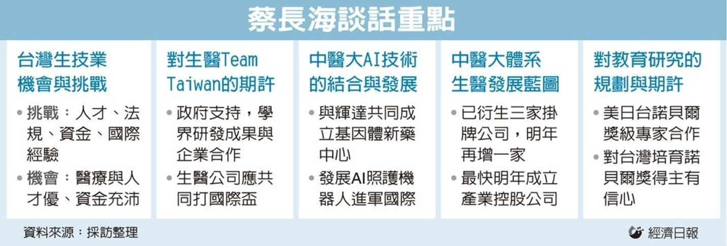 中國醫藥大學暨醫療體系董事長蔡長海表示,中國醫藥大學由人才教育及醫療體系為出發點,近年來積極投入生醫發展,至今已衍生出20家企業及三家掛牌公司。下一步將結合人工智慧(AI)繼續投入新藥開發、再生醫療及智慧醫療,最快明年也將成立產業控股公司。
