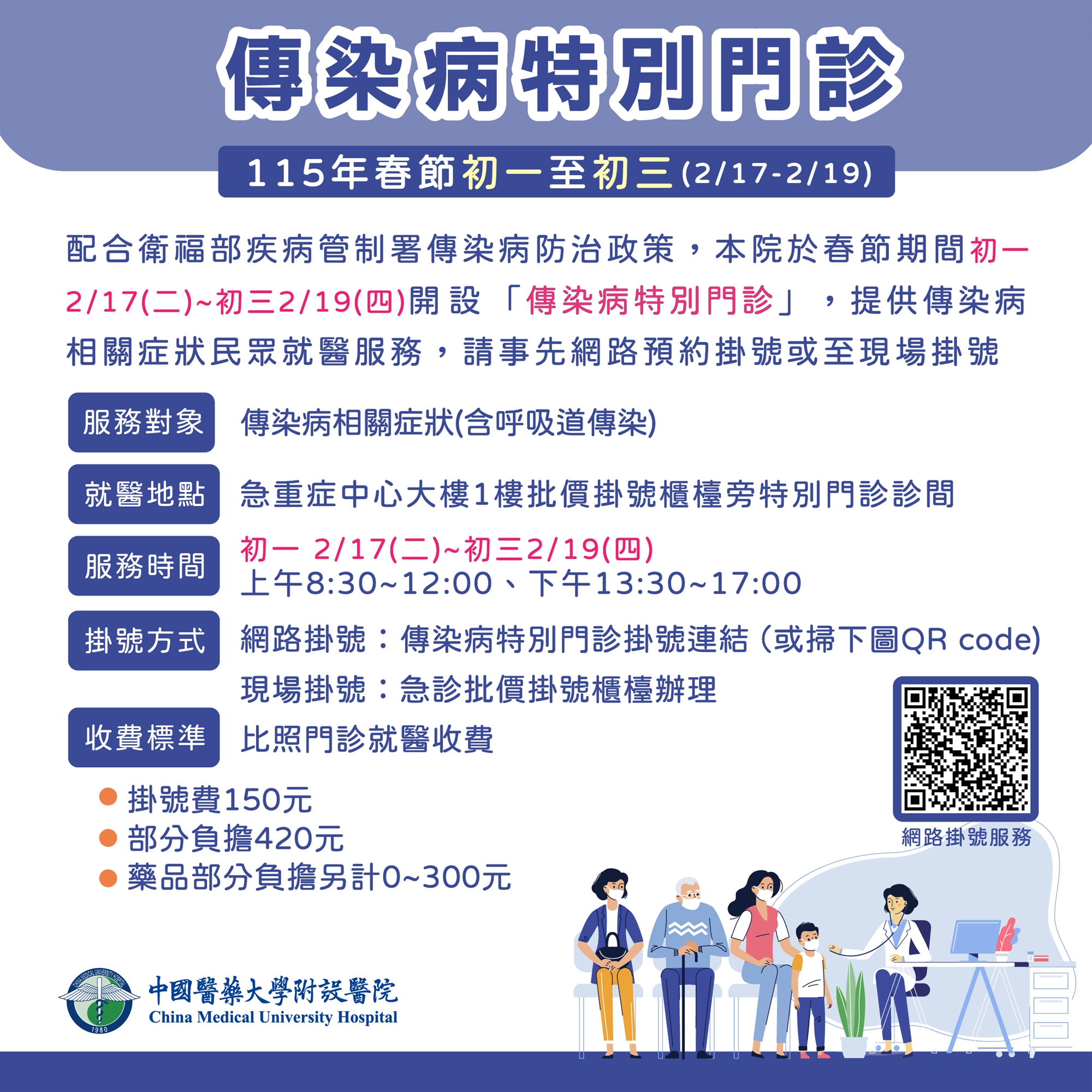 開設時間: 初一 (2/17) ~ 初三 (2/19),開設「上午診」及「下午診」。