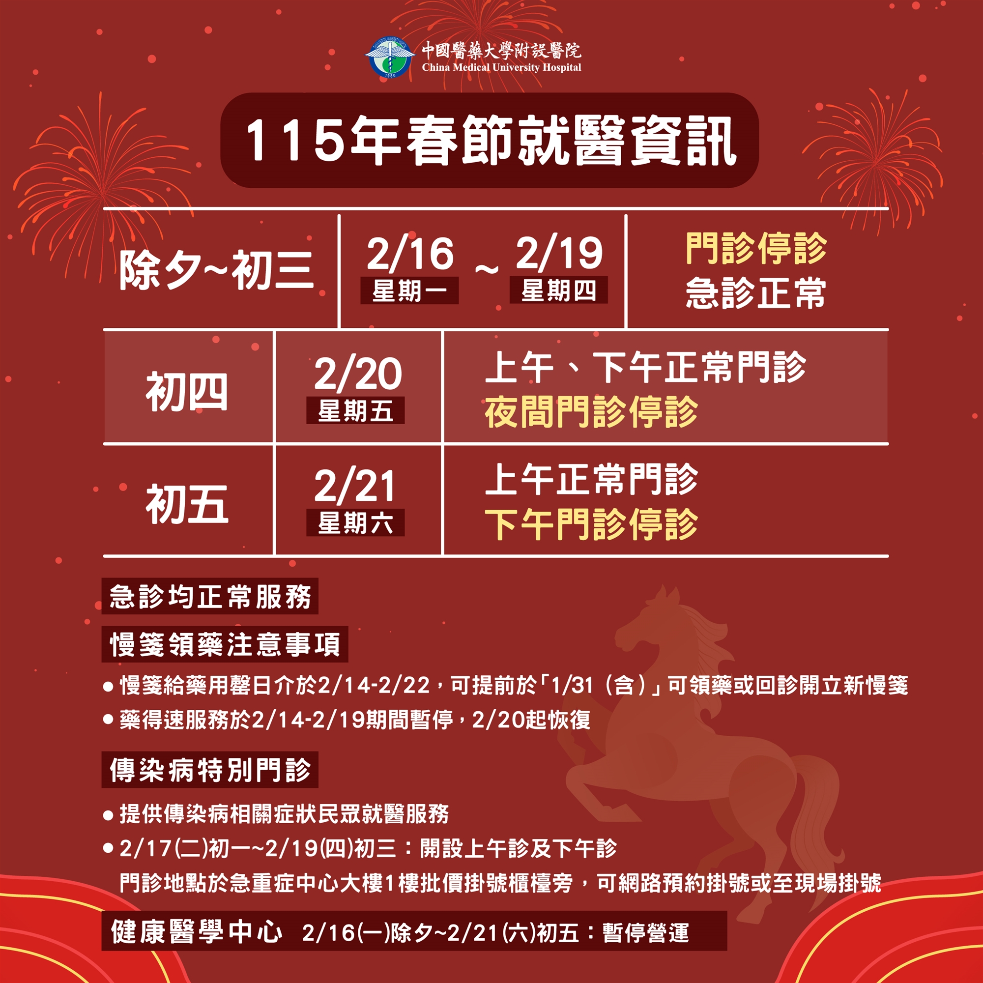 健康醫學中心: 2/16 (除夕) ~ 2/21 (初五) 暫停營運。