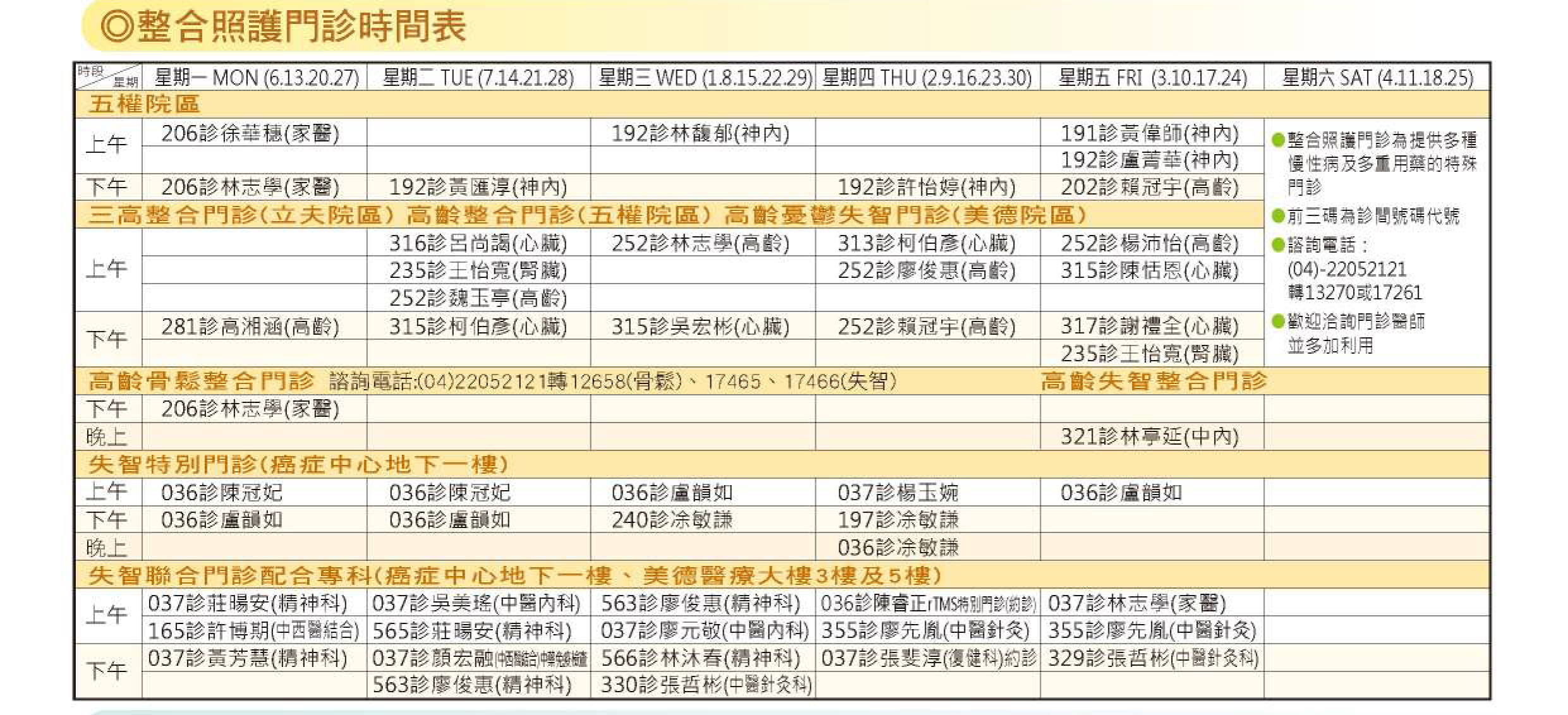門診整合照護服務診次門診時間表: