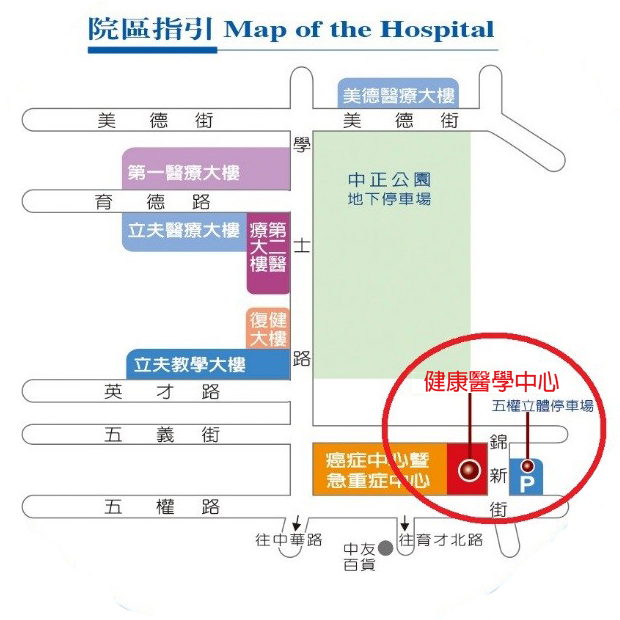 中國醫藥大學附設醫院地址為台中市北區育德路2號,此處為醫院登記地址,而健康醫學中心所在的實際位置為急重症大樓後棟-健康醫學中心大樓(五權路與錦新街口),緊鄰五權立體停車場。
